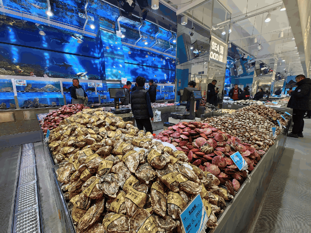 品种上基本做全了水产的主流品项。包括各种高档海鲜,如帝王蟹、毛蟹、面包蟹等也有了平价售卖的感觉;各种冻品、贝类、冰鲜货满堆山;还有鲜活鱼虾蟹,全面强调只卖水产不卖水;此外,海鲜区还提供加工服务,免费蒸煮,其他加工项收取10%的加工费,从而更加方便顾客消费。