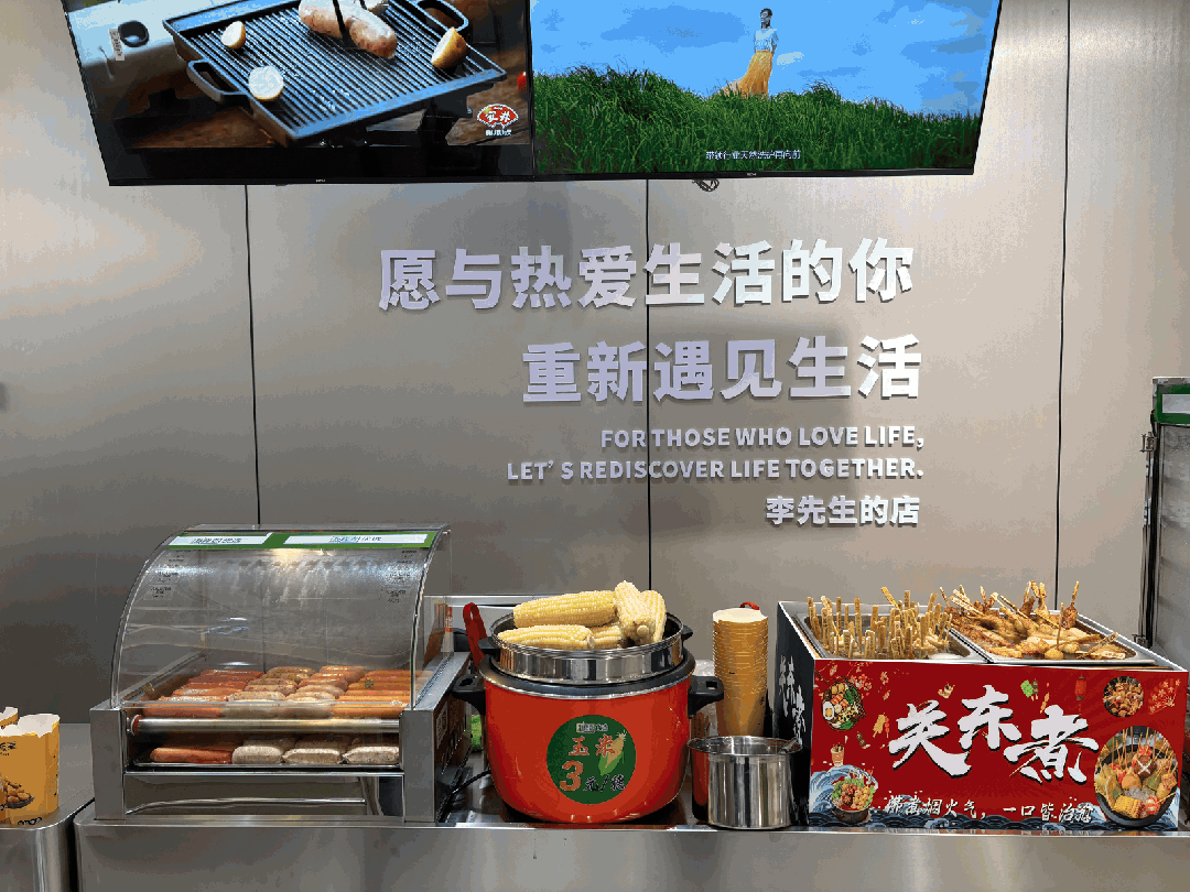 首先是自营项目,有“食光驿站”“手作食铺”和“自制工坊”,包含的烤羊肉串、烤牛肉干及肇东小饼等,透过玻璃,顾客不仅可以看见原料,还可以清晰地看到员工分割、腌肉、切丁、串串及烧烤,让顾客能清晰感受到加工过程。