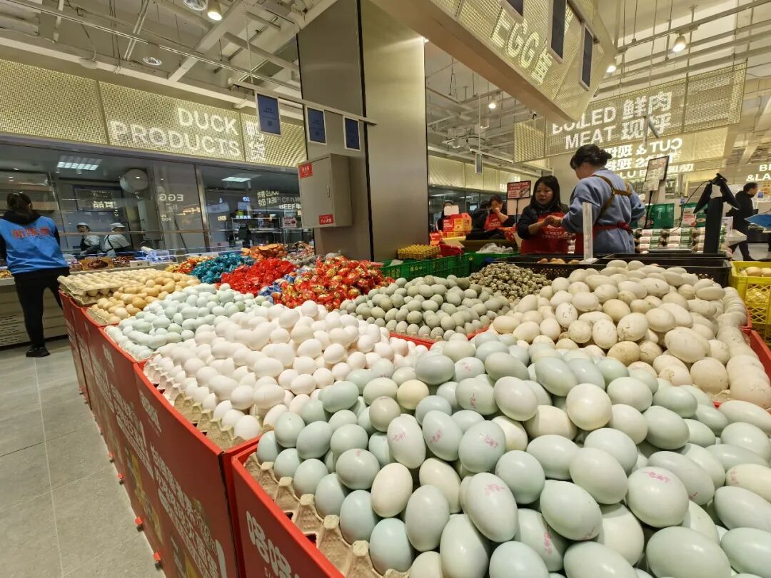 在新隆嘉,蛋品也被归集在蔬菜这一场景中。各种蛋品集中陈列,品种丰富的同时,也更容易营造销售势能,专人推动也有利于提高销售效率。